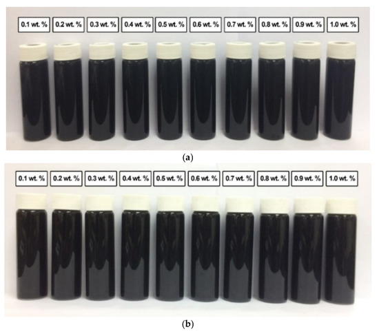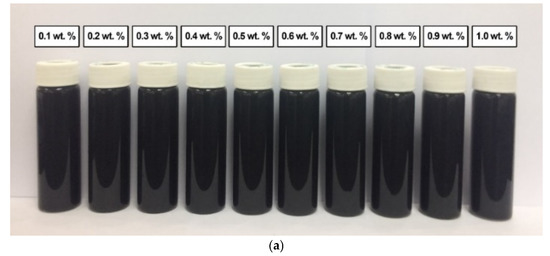 Heating and cooling fluids are employed in numerous industrial settings, including energy supply and generation, electronics, chemical engineering, solar thermal collectors, and automotive. Recently, heat transfer media have drawn the interest of researchers as it is able to transfer heat from one liquid component to another in any process, which makes them a vital component to prevent overheating and severe system breakdown of electronic or automobile applications. In view of this, extensive research has been focused on nanofluids, which are liquid suspensions of nanometre-sized solid particles, including metal oxides, such as titanium dioxide (TiO2) and zinc oxide (ZnO), metals, and carbon-related materials, such as carbon nanofibre (CNF), carbon nanotube (CNT), and graphene, due to their potential application as heat transfer fluids [1,2]. Comparatively, nanofluids exhibit better convective heat transfer capabilities and greater heat conductivities than that of conventional fluids (such as water and ethylene glycol) and at the same time, are able to mitigate the issues of sedimentation, erosion, and clogging related to the suspensions of larger than milli- or micrometre-sized particles [3]. Nevertheless, nanometre-sized liquid suspensions exhibit several downsides, including the potential contamination in the heat transfer media and the agglomeration of nanoparticles that would obstruct the device’s channel, consequently minimising the efficiency of incorporation of nanoparticles in the base fluid for heat transfer applications. Since the stability of nanoparticles in any given fluid is directly associated with the electrokinetic characteristics of the solid–liquid mixture, the synthesis of a stable nanofluid should consider the proper control of pH solution, surfactant addition, and surface modification of the suspended particles. Hence, the rapid sedimentation should be addressed and eliminated in the early preparation stage and synthesis of nanofluids in order to examine the long-term suspension stability of nanofluids [4,5,6].