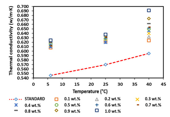 Furthermore, Table 7 shows that the highest enhancement percentage of the thermal conductivity of 14.34, 11.84, and 16.13% at 6, 25, and 40 °C, respectively, was obtained at a CNF concentration of 1.0 wt.%. Interestingly, the thermal conductivity pattern of the nanofluid differed from other nanofluids. In particular, the enhancement percentage of the thermal conductivity at 6 and 25 °C did not conform to the increased weight concentration, while the enhancement percentage was linear with the weight concentration at 40 °C. The varying temperature influenced the agglomeration and Brownian motion of nanoparticles, which consequently led to the drastic alteration of the thermal conductivity of the nanofluids. Based on the kinetic theory of particles, the increase in temperature intensifies the Brownian motion, which also increases the kinetic energy of the nanofluid. As a result, the temperature increment promotes the physical interactions between water molecules and nanoparticles. Therefore, the enhanced thermal conductivity would improve the heat transfer process. Figure 15 illustrates the thermal conductivity of the surface-oxidised CNF-based nanofluids without PVP compared to that of the pure base fluid.