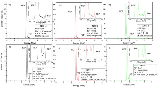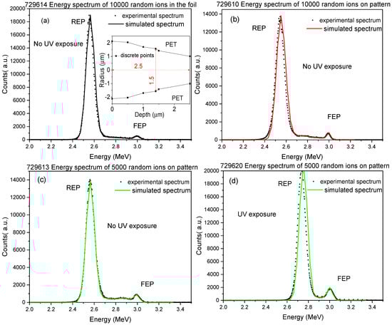 29]. The beam current was set to about 1–2 K particles/s. The helium beam penetrates the PET foil with an energy loss but without creating damage along its trajectory. This occurs thanks to its very low fluence (~10