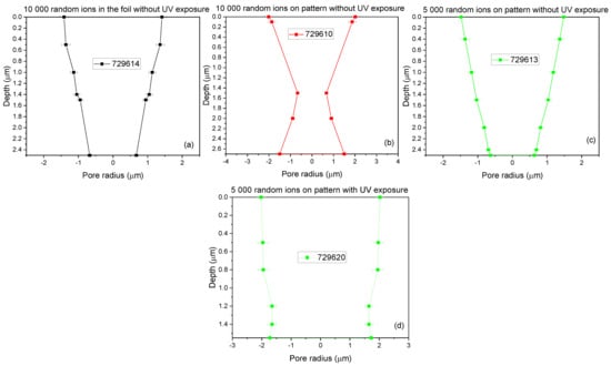 Following the ion irradiation, both sides of the 6 µm thick PET have been subjected to UV exposition treatment for 5 h before the chemical etching using a Herolab GmbH Laborgerate (Wiesloch, Germany) UV lamp working at an intensity of 4 W/m2 in the range 254–361 nm. The samples were immersed in 5N (NaOH) solution at 50 ± 0.5 °C for 2.5 h.