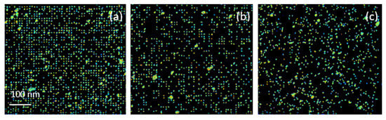 Figure 1b); the ions traverse the pattern from top to bottom and back again over an area of 1000 μm × 1000 µm. The patterns with 10000 and 5000 ions have been irradiated taking into account the random time distribution of incoming ions. This means that the probability of hitting single dots in the pattern is governed by the Poisson distribution where