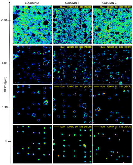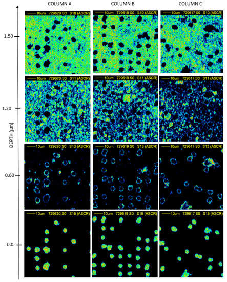 The density maps of the transversal plane of the foils as a function of the depth, from the surface to the full thickness of the PET foil of 10000 random ions in foil (column A), 10000 random ions in pattern (column B), and 5000 random ions in pattern (column C) when the foils have been not exposed to UV are reported in