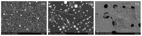 Figure 8a–c)) was observed. Cells were able to grow on PET surface without modification with adhesion proteins, showing no significant differences between porous and pristine PET samples.