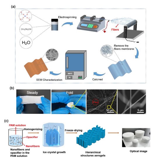 The preparation process is shown in Figure 1c. SiO2 nanofibers membrane was cut into small pieces and soaked in solution 0.01 wt.% PAM solution. Later few drops of TEOS:H2O:EtOH:PPA = 1:4:10:0.01 solution were added into the solution to sustain viscosity. As filler materials with 70 wt.% of silica (for SNFAS samples) or TiO2 (for SNFAT samples) were added while a control group (SNFA) was kept pristine, then the mixed solution was dispersed and homogenized by a high-speed homogenizer. In the freezing procedure, the homogenized nanofibers dispersions were transferred to the desired mold and then frozen in a liquid nitrogen bath. During this process, the ice crystals in the solution rapidly nucleated and grew. After the solvent in the dispersion was completely solidified, a frozen block was obtained. Then, the frozen block was placed in a freeze dryer, and the solvent was directly sublimated from a solid state to a gaseous state by controlled temperature and pressure (−50 °C and 0.05 Pa) to remove the solvent ice crystals without destroying the pore structure of the material to obtain nanofibrous aerogel with particles [].