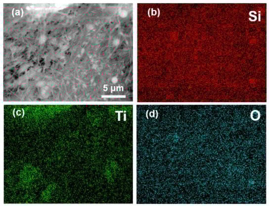 The distribution of TiO2 opacifier particles in the silica nanofibers was further supported by X-ray spectroscopy (EDS) mapping results, as illustrated in Figure 3a–d, Ti element was randomly filled between Si and O elements in SNFAT, which indicated the coexistence of TiO2 opacifier and nanofibers. Moreover, the brighter, clustered green spots in Figure 3c indicated the presence of TiO2 opacifier particles at this location. According to the range of the spots, it can be known that the size of the sunscreen particles is several to several tens of micrometers.