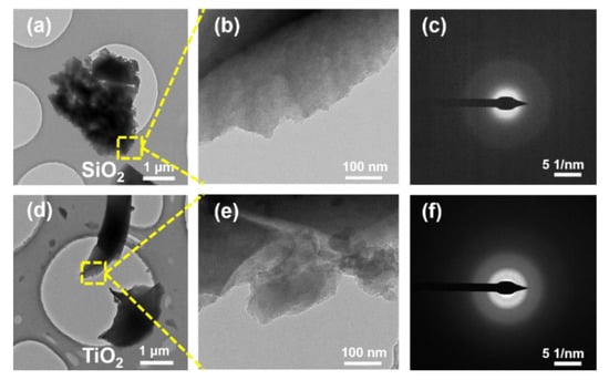 The microstructure of SiO2 and TiO2 particles were observed by transmission electron microscopy (TEM), and the results are shown in Figure 4. The TEM image of the selected area in Figure 4a,b,d,e revealed that both SiO2 and TiO2 particles have a dense structure. Figure 4c,f further showed the amorphous structure of SiO2 and TiO2, indicating the amorphous structure of silica nanofibrous aerogels with particles. The same method was used by Thangavel et al. [] and Gao [] to characterize the amorphous structure of SiO2 and TiO2, respectively, and the results were the same as in this study.