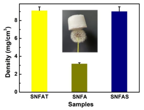 Mechanical properties are essential for practical application of high-temperature thermally insulating nanofibrous aerogels []. The mechanical properties of nanofibrous aerogels with particles were investigated (Figure 6). As shown in Figure 6, nanofibrous aerogels with particles were light enough to stand on a dandelion easily, which can be verified by their densities.