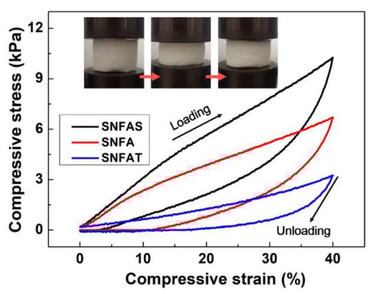 Compared with conventional silica aerogels, SNFAT, SNFAS, and SNFA all exhibited excellent flexibility without fracture and irreversible deformation under larger compression. Stress-strain (σ-ε) curves for a set strain of 40%, which does not cause plastic deformation of the samples [], can be observed in Figure 7, and the three samples can fully recover below ε < 40%. The stress loading and unloading process was illustrated at the red allow in the Figure 7. The Similar to the compressive states of other fibers aerogels [,], two states are clearly observed in the 40% stress-strain (σ-ε) curve: ε < 20% exhibits a linear elastic state with a reduced slope of the compression curve. In the subsequent plateau period of 20% < ε < 40%, stable elastic deformation will occur at this stage. The maximum compressive strengths of SNFAT, SNFAS and SNFA are 3.22 kPa, 10.27 kPa, and 6.71 kPa, respectively, and the samples do not exhibit brittle fracture characteristics which shows that the nanofibers have a toughening effect.