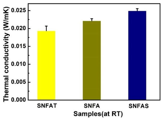 The pore size distribution of the samples was shown in Figure 9; most of the pore sizes were concentrated in 5–20 nm. The size of mesopores are even smaller than the mean free path of air molecules, which has more inhibitory effect on gas heat flow []. Notably, the number of the mesopores located in 5–10 nm of the sample SNFAT were much more than that of the samples SNFA and SNFAS, so the gas-phase thermal conductivity of SNFAT should be much lower than the control samples. Interestingly, we found that the radiative thermal conductivity at room temperature also has a non-negligible contribution to the heat conduction, which will be proved in Section 3.4.