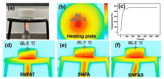 At high temperature, the thermal conductivity of aerogels is mainly radiative heat transfer. In order to further study the thermal insulation properties of SNFAT, SNFA and SNFAS, dynamic distribution of the temperature heated by the flame was observed by an infrared thermal imager, as shown in Figure 10. The heating plate was heated on the alcohol lamp for 10 min in advance to ensure the constant temperature of the heating plate in the subsequent heating process (Figure 10b); the heating process was shown in Figure 10c. SNFAT, SNFA and SNFAS with a thickness of 2.5 cm were placed on a heating plate at 475.2 ± 4 °C for 10 min (Figure 10d,e). It can be clearly seen that the nanofibrous aerogel with particles has different temperature layer distributions, the height of the red high temperature layer of SNFAT is nearly 50% lower than that of SNFAS and SNFA, and the temperature of the cold end is 43.3 °C, 55.5 °C, 57.7 °C, respectively (Figure 10c–e). This data has proved that SNFAT, SNFA and SNFAS have excellent high-temperature thermal insulation properties, and that the thermal insulation effect of SNFAT was particularly outstanding, which probably due to the good infrared radiation suppression effect of TiO2.