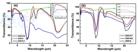 Infrared transmittance of SNFAS, SNFA and SNFAT. (a) No heat treatment. (b) Heat treatment at 800 °C.