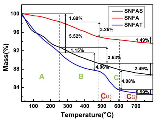 Thermogravimetric (TG) curve reflected the transformation process of the weight of three nanofibers aerogels. As shown in Figure 12, the TG curves of SNFA and SNFAS have three different stages []. In stage A (20–250 °C), the residual solvent and adsorbed water are evaporated, the samples weight were reduced by 1.69% and 7.21%, respectively. Then, in stage B (250~480 °C), the decomposition of PAM caused the weight loss of 3.25% and 3.53%. The side chains if polymer started to break and the inorganic transformation was completed in stage C (480~800 °C). The stage C of SNFAT was divided into two parts (C (1) and C (2)). The weight loss of Stage C (1) may be caused by the transition of titanium dioxide from amorphous precipitate to anatase phase []. The stage C (2) was identical to the stage C of SNFA and SNFAS.