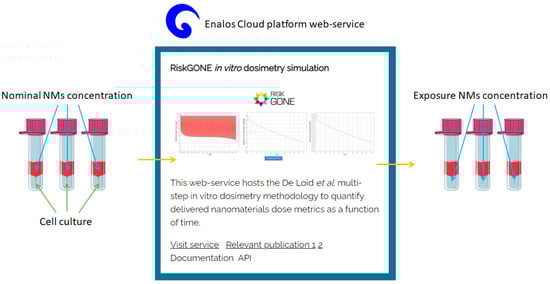 The “in vitro dosimetry” tool was developed as a single web-page application using Java and the zk framework. All underpinning calculations were performed on NovaMechanics servers, and the results generated are presented as tabular and graphical outputs for easy download. The application is available as part of the RiskGONE instance of the Enalos Cloud Platform, as shown in Figure 1: http://www.enaloscloud.novamechanics.com/riskgone.html (accessed on 31 October 2022). The “in vitro dosimetry” application is detailed in the following paragraphs.