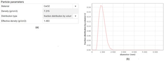 The Particle parameters section of the “in vitro dosimetry” web application. (a) The basic input parameters. The user can select from various NPs whose parameters are pre-loaded, or can define new NPs and input the required information on density and effective density themselves, as well as the particle size distribution type (i.e., volume distribution (mass) or particle number distribution). (b) Illustration of the particle size distribution of the CeO2 NPs dispersed in Eagle’s minimum essential medium (EMEM) cell culture medium with 10% fetal bovine serum presented as the fraction distribution by volume for the specific NP.