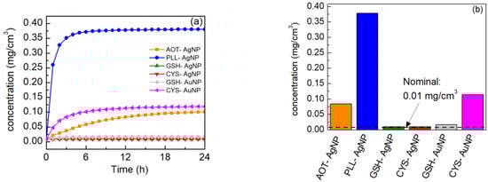 Evolution of the NPs’ concentration at the bottom of the wells of the cell culture plates used for the in vitro assays, as simulated by the “in vitro dosimetry” web application, can be seen in Figure 4a. After obtaining the NPs concentrations in the bottom compartment of the assay plates for a 1 h time interval, the median value was calculated. The latter is shown in Figure 4b. Our calculation demonstrated that accumulation of NPs at the bottom of the wells can be considered a complex process and cannot be explained only by the NPs’ size, but it is also influenced by the surface charge and the type of surface coating. For example, sedimentation of the PLL-AgNP reached equilibrium in less than 8 h, resulting in the highest number of NPs at the bottom of the wells compared to all other NPs tested. A similar sedimentation rate was observed for GSH- and CYS-AgNPs, while the AOT-AgNP sedimentation was much slower and did not reach a plateau until almost 24 h. Despite the deposition of larger NPs being expected to be enhanced by the impact of gravity compared to smaller NPs, such a trend was not obvious as a smaller amount of the larger-sized AOT-AgNP (48.1 ± 2.0 nm) settled to the well bottom compared to the smaller CYS-AuNP (18.7 ± 11.1 nm). Comparison of the nominal (dispersion concentration) and the effective concentrations in the bottom layer close to the cells, as calculated by the “in vitro dosimetry” web application, indicates that the cells are exposed to a much higher concentration of some of the NPs than what can be assumed from the reported nominal values, while this exposure amount is dependent on the NPs’ behavior in the dispersion, i.e., sedimentation rate and possible agglomeration, which is unique for each NP type (see Figure 4b).