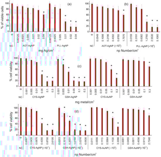 L929 cell viability after 24 h treatment with different concentrations of AOT- and PLL-coated AgNP (a,b), and L929 cell viability after 24 h treatment with different concentrations of CYS- and GSH-coated AgNP and AuNP (c,d). In (a,c), concentrations are expressed as the nominal concentrations, i.e., mg of metal per cm3 of cell culture medium in the initial dispersion, while in (b) and (d) the results are presented as the response in cell viability using the calculated number of NPs deposited per unit area of the well bottom determined utilizing the “in vitro dosimetry” web application. Percentages of viable cells are expressed relative to the negative control (NC, cells treated with medium only). The values marked with an asterisk (*) differ significantly from the negative control (p < 0.05).