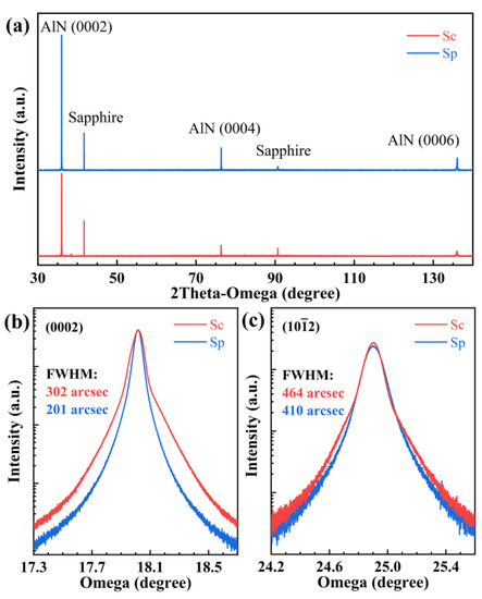 The (0002) and X-ray rocking curves (XRC) from different substrate samples are shown in Figure 1b,c. The XRC of Sc shows distinct asymmetry and a shoulder at larger omega values; this splitting phenomenon of the diffraction peak could be caused by the polarization of the AlN film. The FWHM of the rocking curves’ symmetric and asymmetric diffraction indirectly reflects the TDs density of different types. The FWHM of symmetric diffraction (0002) is sensitive to the density of pure screw and mixed type TDs, while the FWHM of asymmetric diffraction can effectively reflect the pure edge and mixed type TDs [21]. According to the FWHM of the rocking curve, TDD can be calculated quantitatively, expressed as: