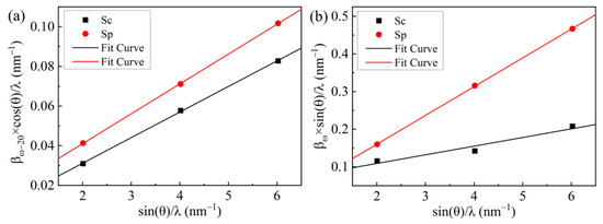 Figure 2 shows the Williamson–Hall plot for the AlN epilayers, where ω scan and ω–2θ scan have been measured for three symmetric reflections: (0002), (0004) and (0006). The corresponding parameters of AlN epilayers are deduced by linear fitting from Figure 2. It can be derived that the lateral coherence length L//, vertical coherence length L⊥, dislocation tilt angle βt and non-uniform strain for Sc are 45.70 nm, 68.40 nm, 0.076°, 0.015, respectively. Those data for Sp are 92.76 nm, 79.20 nm, 0.023°, 0.012, respectively. The results show that the grain size of the Sp sample is larger and the non-uniform strain in the growth direction is smaller.