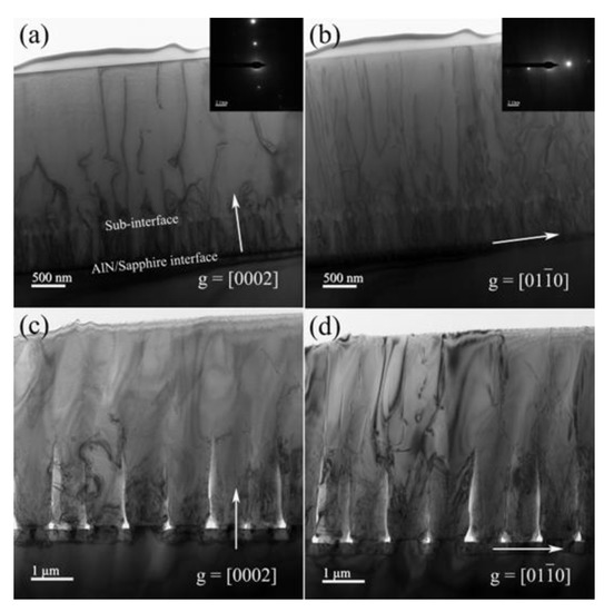 - Bai, J.; Dudley, M.; Sun, W.H.; Wang, H.M.; Khan, M.A. Reduction of threading dislocation densities in AlN/sapphire epilayers driven by growth mode modification. Appl. Phys. Lett. 2006, 88, 051903. [Google Scholar] [CrossRef]
