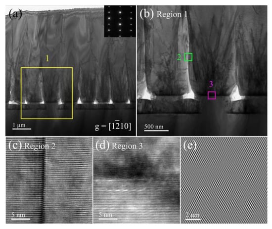 It can be seen from Figure 5a that at the beginning of the growth process, a large number of defects are introduced due to lattice mismatch and thermal mismatch between the substrate and film, forming a dislocation pile-up region and mainly TDs. The TDs are generated by the growth interface and propagate to the surface along the growth direction. As the growth proceeds, the film completely coalesces up to a thickness of ~2 μm from the substrate, and the TDs propagating upward at the closure interface are greatly reduced. The distribution and variation of TDs can be more easily observed in Figure 5b; some dislocations bend or propagate laterally toward free interface before the hole is coalesced, which may be caused by the internal stress. The TDs will preferentially penetrate the areas that are more likely to be exposed. This behavior is beneficial to prevent the TDs propagating to the surface of the film, thus the TDD is effectively reduced. Furthermore, a large fraction of the dislocations is annihilated in the form of fault loops and coalescing dislocations. The decrease in dislocation density is due to the fact that the adjacent dislocations have opposite Burgers vectors forming a loop as the thickness of the epilayer increases [27]. As a result of stress variation near the interface, some TDs could be terminated and not penetrate into the epilayer surface owing to the dislocation line energy minimization [28]. HRTEM measurement is performed to focus on the interface of regions 2 and 3. On the AlN epilayer coalescence interface, we can see the severe lattice mismatch, while dislocations penetrate to the sample surface, as shown in Figure 5c. This is also why the EPD of sample Sp are more likely to be revealed by wet etching. In Figure 5d, the dislocations at the interface are very dense and appear as a black blur, so it is difficult to clearly distinguish the crystal plane. However, by the inverse FFT of Sp interface in Figure 5e, it can be seen that the interface of the nano-patterned substrate has a higher density of misfit dislocations than the flat substrate. The strain could be easily relaxed by the large number of grain boundaries in the hexagonal columnar regions in the process of decreasing temperature, resulting in high-density TDs [29].