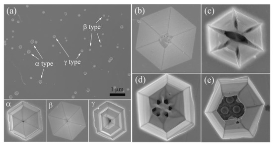 Wet selective etching has a strong corrosive effect on defective surfaces with strain zones and chemical inhomogeneity, such as dislocations and impurity streaks. An aqueous KOH solution of 5 mol/L was used to etch the AlN materials at 80 °C with holding time for 12 min, and the surface morphology after etching was observed by SEM, as shown in Figure 6a. Three different morphologies of etch pits are found, which can be referred to as α-type, β-type, and γ-type etch pits, respectively. The α-type etch pit corresponds to a pure screw dislocation with a spiral stepped structure. As etching proceeds, the chemical stability of the Al surface will prevent further etching in the vertical direction, while the etching rate in the lateral direction remains constant. The β-type etch pit represents pure edge dislocations. Each atom on the edge dislocation line has a dangling bond which is easily etched, so the corrosion proceeds continuously along the vertical dislocation line direction, forming an inverted hexagonal pyramid β-type etch pit. The γ-type etch pits are a combination of the α-type and β-type, combining the characteristics of both, and therefore belong to mixed type dislocation. Under optimal etching conditions, over-time etching resulted in over-etching of the samples and also the merging of etch pits together. From Figure 6a, it can be seen that the size of α-type etch pits is the largest, while the size of β-type etch pits is the smallest, indicating that in the etching process pure screw dislocations are more susceptible to erosion by etchant. Under the same etching conditions, AlN grown on a flat sapphire substrate is less prone to show up etch pits than that on the patterned substrate. This is mainly due to the fact that while patterned substrates can effectively promote the merging and annihilation of dislocations, it also tends to form vertically extending dislocation bundles, which makes them more likely to propagate in the epitaxial layer and thus corrode at the surface outcrop. Details of EPD for both AlN samples are listed in Table 2. The etch pit densities of the Sc and Sp samples are 1.23 × 109 cm−2 and 1.04 × 108 cm−2, respectively. It can be seen that the growth of the AlN epilayer on the nano-patterned substrate is beneficial to reduce the TDDs and improve the crystal quality of the AlN epilayer.