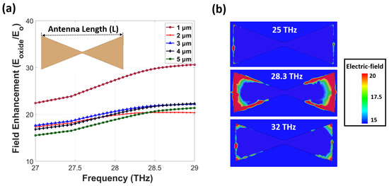 To ensure maximum enhancement in the oxide barrier, we optimized the antenna length and width for resonance at 28.3 THz. The field enhancement is defined as the ratio between the magnitude of the electric field at the measurement point and the incident electric field (E/E0). Here, E0 means the y-polarized plane wave with a field intensity of 1 V/m. To calculate the field enhancement level accurately, we placed four Al2O3 boxes with 5 nm × 5 nm × 4 nm dimensions under the four antenna edges with small mesh sizes and obtained the average field enhancement value. Figure 2a shows the averaged field enhancement inside the oxide layer below the antenna edges as a function of the antenna length (L). We found a maximum field enhancement of 29 for a 1 μm-long antenna with lower, but almost similar, values from 2–5 μm-long ones. We then selected the shortest length of 2 μm longer than 1 μm to secure the antenna pattern more accurately during the lithography process and simultaneously reduce deposition time and expense. Figure 2b shows a cross-sectional view of the field enhancement on the top of the thin oxide layer below the 2 μm-long antenna at different resonant frequencies, 25, 28.3, and 32 THz. Maximum enhancement is observed at the antenna edges at 28.3 THz and there is a reduction of the concentrated field when moving further from the resonant frequency.