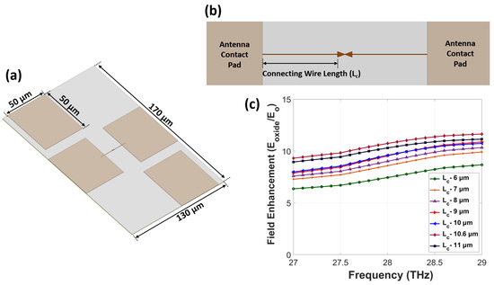 Figure 3a shows the geometry of the nanoantenna-integrated MOS diode with measurement pads. We used four different pads of size 50 μm × 50 μm to connect the antenna and p-doped silicon. The overall size of a single device was 130 μm × 170 μm. After fixing the antenna geometry, we tuned the lengths of the connecting metallic wires (Lc) between the nanoantenna and measurement pads, which were used for mounting the probes. Here, the width of the wire was set to be 100 nm. The centers of the sides of the two antenna arms were connected to two metallic pads, as shown in Figure 3b. The measurement pads on the upper left and lower right corners were connected to the p-doped silicon layer through via connection. To ensure maximum field enhancement with a minimum effect from the connecting wire, we optimized Lc. Figure 3c shows the field enhancement variation for different values of Lc. As we varied Lc from 6 to 11 μm, we observed the maximum enhancement from a 10.6 μm (1λ)-long wire due to in-phase excitation between the two ends of the connecting wires.