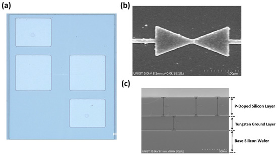 The fabrication of the nanoantenna-coupled MOS tunnel diode was carried out by using the standard CMOS process. The process started with a p-type <100> 100 mm Si wafer. To remove the surface roughness created by native oxides over the Si wafer, buffered oxide etching (BOE) was performed. After etching, a 200 nm tungsten (W) ground layer was deposited by DC sputtering and a 400 nm poly-silicon layer was deposited over the ground layer using low pressure chemical vapor deposition (LPCVD) process. E-beam lithography was then used to pattern the p-type doping area with perfect alignment and to cover the remaining area with an e-beam resist to prevent dopant diffusion. Single-stage heavy boron implantation was then performed for p-type doping with a dose of 6.4 × 1014 cm−2 at 70 keV energy. Thermal annealing at 1000 °C for 10 s was carried out to activate and spread the dopants inside the poly-silicon layer. A very thin (4 nm) Al2O3 tunnel oxide layer was then deposited using atomic layer deposition (ALD) to ensure uniform distribution over the surface. Following the deposition process, the sample was coated with an e-beam resist and a bowtie-shaped nanoantenna, including connecting wires, and was patterned through an e-beam lithography lift-off process. With perfect position and alignment, a 10 nm-thick Ti adhesion layer and a 100 nm-thick Al antenna layer were deposited using the e-beam evaporation process. Before the deposition of four measurement pads, via holes with a diameter of 5 μm were etched in the p-doped silicon layer with a depth of 50 nm to ensure proper connection between the measurement pad and p-doped layer using inductively coupled plasma reactive ion etching (ICP-RIE). Finally, 50 μm × 50 μm contact pads were patterned through photolithography process and a 200 nm-thick Ti layer was deposited through the thermal evaporation. The fully processed four-terminal devices were imaged using a DM 4000M optical microscope (Leica Microsystems, Wetzlar, Germany) and a SU8220 scanning electron microscopy (SEM) (Hitachi High-Technologies, Tokyo, Japan).