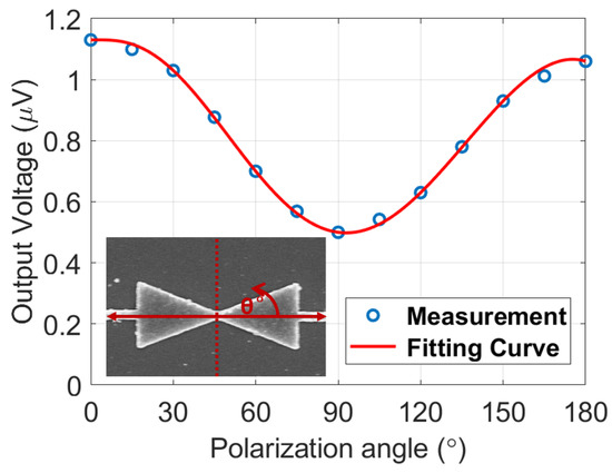 Next, the IR performance of the nanoantenna-coupled MOS tunnel diode devices was measured at 28.3 THz at zero bias condition to check the rectification ability of the devices. During the IR measurements, the devices were illuminated with a linearly polarized CO2 laser operating at 10.6 μm (28.3 THz) with a power density of 1.77 W/cm2 and the polarization state of the electric field (E0) was set parallel to the antenna axis. The laser beam was modulated using a mechanical chopper with a frequency of 1 kHz and the laser beam was passed through a half-wave plate (HWP) to ensure proper polarization alignment with the antenna axis. Finally, the Voc response of the device was measured using a SR830 DSP lock-in amplifier synchronized with the chopper. We measured the Voc of the linear device and the value was 1.1 μV for 0° polarization angle of the incident wave. We also measured the polarization-dependent Voc from the device and confirmed that a maximum Voc of 1.1 μV is maintained when the polarization angles of the illuminating beam (0° and 180°) were aligned with the antenna axis. Conversely, a 90° polarization angle perpendicular to the antenna axis results in a minimum Voc of 0.5 μV. The polarization-dependent nature of the linear device is shown in Figure 7, demonstrating the proper nanoantenna functionality of the device.