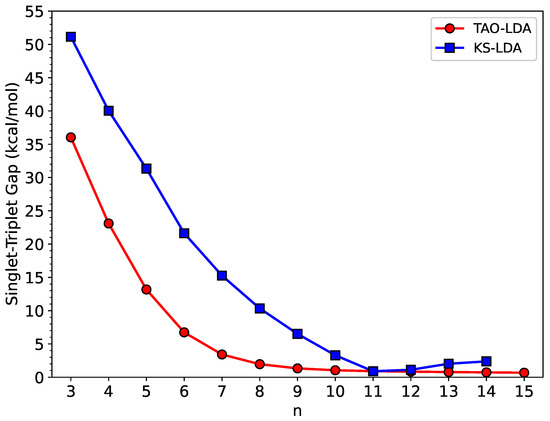 To obtain the ground state of n-HGQR, we resorted to the singlet–triplet (ST) gap. First, we carried out KS-LDA and TAO-LDA calculations for the lowest spin-unrestricted triplet energy () and lowest spin-unrestricted singlet energy () of n-HGQR at the respective optimized geometries. Subsequently, we computed the ST gap () of n-HGQR using