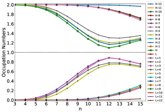 Active TAO-orbital occupation numbers (H − 12, H − 11, …, H − 1, H, L, L + 1, …, L + 11, and L + 12) of ground-state n-HGQR, calculated by spin-restricted TAO-LDA.