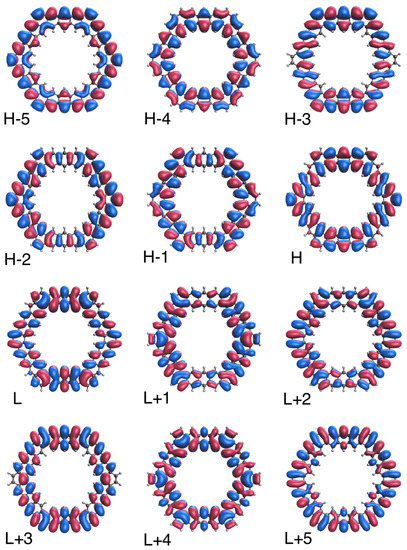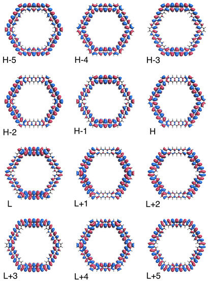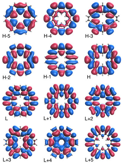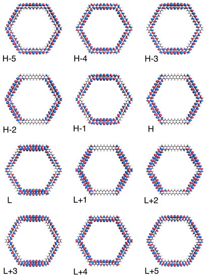 To further illustrate the transition from the nonradical to polyradical nature of ground-state n-HGQR in real space, we plot the visualization of active TAO-orbitals (H − 5, H − 4, …, H − 1, H, L, L + 1, …, L + 4, and L + 5) of ground-state n-HGQRs (n = 3, 5, 7, and 9), calculated by spin-restricted TAO-LDA. As shown in Figure 6, Figure 7, Figure 8 and Figure 9, when the n-HGQR size is small (e.g., ), the active TAO-orbitals are delocalized over the entire n-HGQR. Nonetheless, as the n-HGQR size increases, the active TAO-orbitals have an increasing tendency to localize at the inner and outer edges of n-HGQR. Consequently, the active TAO-orbitals of the larger ground-state n-HGQR (e.g., ) are mainly localized at the two edges of n-HGQR.
