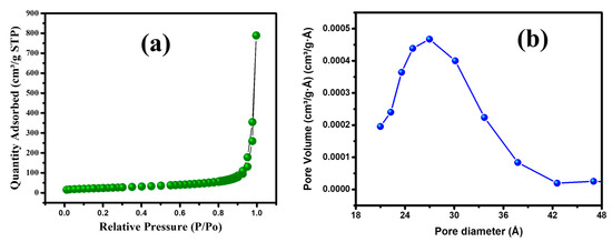 The textural properties of the prepared MGCN, including specific surface area and pore diameter, are analyzed by nitrogen gas sorption analysis. Figure 1a depicts N2 adsorption–desorption isotherms. The results manifest the presence of mesopores as it displays a type IV isotherm of the IUPAC with a clear hysteresis loop (H2) within the range 0.0–1.0 of relative pressure. The pore size distribution is displayed Figure 1b and calculated adopting the procedure of Barret–Joyner–Halender (BJH). The as prepared MGCN exhibits 84.4 m2 g−1 surface area and 0.87 m3 g−1 average pore volume. Higher surface area and large pore volume are beneficial to improving the adsorption efficiency of metal ions from water due to the increase of the active sites at nanoparticle’ surface [26,36].