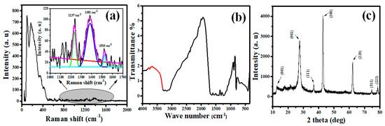 (a) Raman spectrum, (b) FTIR spectrum, and (c) XRD pattern of MGCN sorbent.