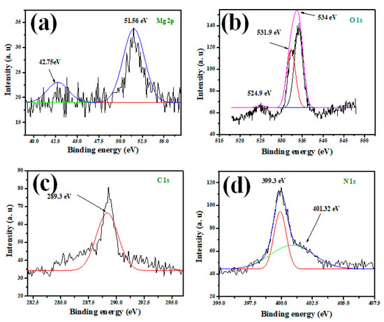 XPS spectra of (a) Mg-2p, (b) O-1s, (c) C-1s, and (d) N-1s for MGCN sorbent.
