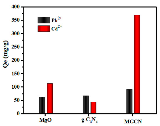 To compare the Pb++ and Cd++ adsorption capacities of MgO, g-C3N4, and MGCN, a series of adsorption experiments were conducted at a fixed initial heavy metals concentration of 45 mg g−1 and a pH value 5, and the obtained results are given in Figure 5. It is interesting to note that MGCN demonstrates selective adsorption towards Cd++ compared to Pb++, i.e., the adsorbed amount is more than three times higher (90.83 mg g−1 for Pb++ and 367.73 mg g−1 for Cd++). Furthermore, the adsorption capacity of MGCN towards Cd++ is substantially higher than the respective capacities of pure g-C3N4 (42.50 mg g−1) and MgO (112.43 mg g−1). For Pb++, the adsorption capacity increases slightly, reaching 62.13 mg g−1 for MgO followed by 67.13 mg g−1 for g-C3N4 then up to 90.83 mg g−1 for MGCN. The obtained results highlight the synergistic effect as consequence of combining of 3D MgO NPs with 2D g-C3N4 nanosheets.
