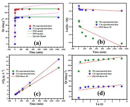 The study of kinetics is essential to better elucidate the adsorption process. The adsorption rate is crucial in the metal ions’ adsorption onto the adsorbent. Hence, the time-dependent adsorption experiment has been carried out to estimate the adsorption rate, and the obtained results are illustrated in Figure 7a. A contact time ranging from 0 min to 24 h is adopted during the adsorption experiments. It is clearly observed that the adsorption capacity increases sharply with the contact time, and in less than 50 min, the equilibrium is attained.