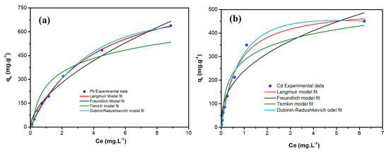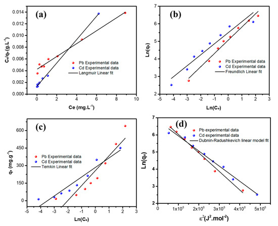 Linear adsorption equilibrium isotherms of Pb++/Cd++ onto MGCN sorbent fitted with the (a) Langmuir, (b) Freundlich, (c) Temkin, and (d) Dubinin–Radushkevich models.