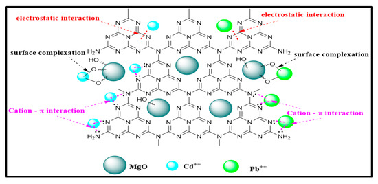 Moreover, the peak at 889 cm−1 ascribed triazine ring (C3N3) mode also slightly shifted to 881 cm−1 for Pb++ and 874 cm−1 for Cd++. The delocalized electron of the tri-s-triazine ring (C3N3) acts as Lewis’s base, as mentioned by Xiao et al., while the metal ions act as Lewis’s acid [41]. Accordingly, the electrostatic interaction involved during adsorption of heavy metal ions onto MGCN occurs through the Lewis base–acid interaction. Figure 12 illustrates the main sorption mechanism of Pb++ and Cd++ ions onto the MGCN sorbent.