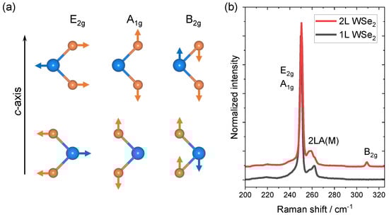 (a) , , and vibrational modes of 2H-phase bilayer WSe. (b) Raman spectra of monolayer and intrinsic bilayer WSe.