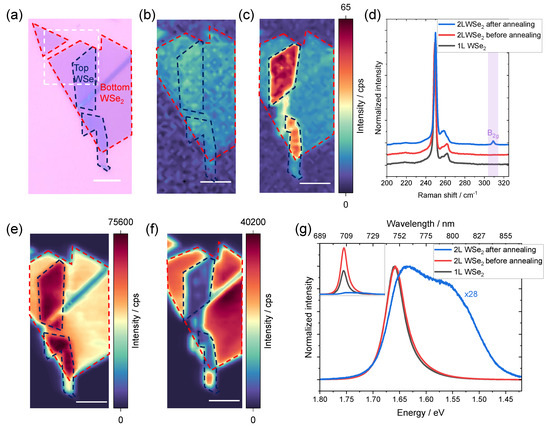 Indeed, as shown in the Raman intensity map and spectra in Figure 2b–d, the mode does not exist in monolayer WSe and bilayer WSe before annealing. However, a clear peak emerges after annealing. The shape of the monolayer flake in the Raman intensity maps in Figure 2b,c originates from the slight change in the background signal. Since a dielectric substrate is used for the sample, the influence of the substrate is negligible in this case. Therefore, PL provides strong additional evidence for the interlayer coupling. As shown in the PL intensity map before annealing in Figure 2e, the PL intensity is extremely high due to the direct bandgap nature of monolayer WSe, which leads to high radiative recombination efficiency [3,57]. The uncoupled bilayer emits almost twice the intensity as the monolayer part. However, a strong PL quenching is observed on the bilayer part after annealing, as demonstrated in Figure 2f. The strong decrease in PL intensity is caused by the change from direct bandgap in monolayer to indirect bandgap semiconductor in bilayer [3]. An extra emission feature corresponding to the indirect bandgap transition is also observed in Figure 2g. The PL measurements are in excellent agreement with the Raman measurements confirming that the as-transferred bilayer is not coupled, while becoming strongly coupled after annealing. Note that the bilayer area rolled up a bit after annealing along the wrinkle, which causes a slight change in the sample area before and after annealing (as shown in Figure S3 in the Supplementary Information). The comparison of optical microscope images before and after annealing can be found in the Supplementary Materials. All spectra displayed here are taken from the non-rolled-up area.