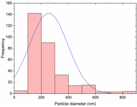 The surface of the GSLP-Fe was studied to determine the size of these structures present on it. The SEM images were analyzed using an image processing and analysis program called ImageJ [21]. Figure 2 shows the histogram obtained from these analyses. Most of the particle diameters were between 100 and 200 nm. The mean particle diameter was 254 nm, with a standard deviation of 142 nm. The normal distribution curve indicated that 99% of the particle diameters were between 0 and 680 nm.