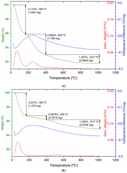 Thermogravimetric analyses (TGAs) were performed to check whether organic matter was adsorbed on the material during the treatment with the eucalyptus extract. GSLP-Fe(0) pellets (D3 and D2) and GSLP-Fe pellets (D3 and D2) were analyzed in the presence of air. The TGAs performed with both pellet sizes were very similar. Figure 3 shows the TGAs of GSLP-Fe(0) and GSLP-Fe D3 as examples. All TGA graphs presented a slope indicative of multi-step decomposition. All TGAs indicated a very similar mass loss (3.5–4%) from 25 to 168 °C. This mass was associated with water loss. Between 170 °C and 400 °C, a clear difference could be seen in the slopes of the TGAs. In the GSLP-Fe(0) TGA, a mass loss of 2.5–2.8% appeared, while in the GSLP-Fe TGA, no clear mass loss was observed in this temperature range. This confirmed that, during the treatment with the eucalyptus extract, a small amount of biomass was adsorbed on the material.