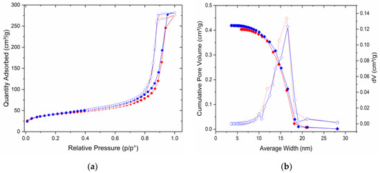 (a) N2 adsorption (filled circles) and desorption (empty circles) isotherms for GSLP-Fe(0) D2 (red) and GSLP-Fe(0) D2 chromium desorption and Fe(0) regeneration (blue). T = 77 K. (b) Pore size distribution (hollow diamonds) and cumulative pore volume (filled diamonds) for GSLP-Fe(0) D2 (red) and GSLP-Fe(0) D2 chromium desorption and Fe(0) regeneration (blue).