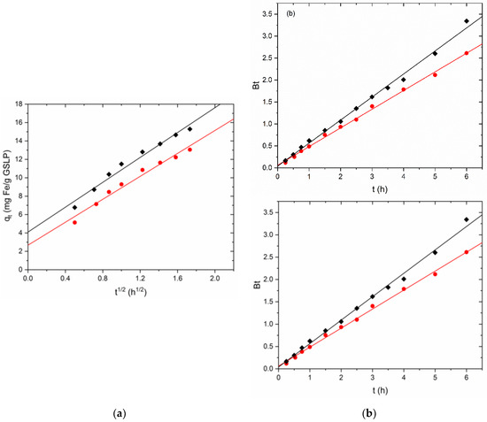 (a) Linearized adsorption kinetics of Fe(II) sorption by GSLP D3 (●) and GSLP D2 (♦) using the Webber–Morris model. (b) Linearized Fe adsorption kinetics of Fe(II) sorption by GSLP D3 (●) and GSLP D2 (♦) using the Boyd model. GSLP dose of 2 g·L−1, natural pH (ca. 5), room temperature, and stirring at 200 RPM.