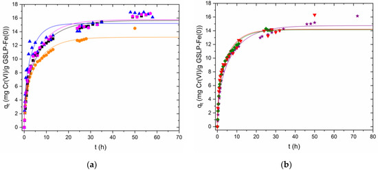 The nonlinear Boyd model showed worse fittings for Cr(VI) removal kinetics than those obtained for Fe(II) sorption. The model fit the beginning of the kinetics well but did not correctly describe the trend of the slower kinetics where the reaction proceeded slowly and did not reach a plateau (Figure 6a,b). R2 values from 0.917 to 0.986 were obtained.