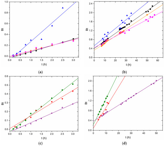 Linearized kinetics of Cr(VI) removal by GSLP-Fe(0) using the Boyd model. (a) First linear part of the kinetics using GSLP-Fe(0) D3. (b) Second linear part of the kinetics using GSLP-Fe(0) D3. (c) First linear part of the kinetics using GSLP-Fe(0) D2. (d) Second linear part of the kinetics using GSLP-Fe(0) D2. All experiments were acidified using HCl 4M. (■) pH ≈ 1.2, initial Cr(VI) concentration: 50 mg·L−1; (●) pH ≈ 0.8, initial Cr(VI) concentration: 50 mg·L−1; (⬟) pH ≈ 0.8, initial Cr(VI) concentration: 75 mg·L−1; (▲) pH ≈ 0.8, initial Cr(VI) concentration: 100 mg·L−1. (★) pH ≈ 1.2, initial Cr(VI) concentration: 50 mg·L−1; (♦) pH ≈ 0.8, initial Cr(VI) concentration: 50 mg·L−1; (▼) pH ≈ 0.8, initial Cr(VI) concentration: 75 mg·L−1.