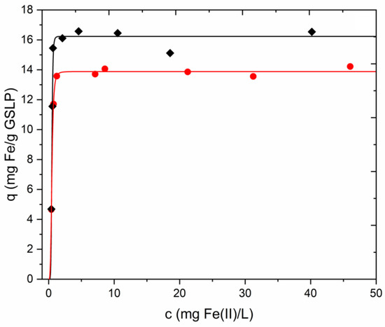 Experimental data for Fe(II) sorption on GSLP D3 (●) and GSLP D2 (♦). Solid lines were obtained by fitting with Equation (8). GSLP dose of 2 g·L−1, natural pH (ca. 5), room temperature, and stirring at 200 RPM. Initial Fe(II) concentration from 10 to 75 mg·L−1 was used.
