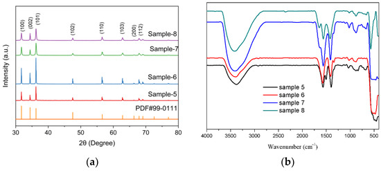 Figure 4b showed the FTIR spectrum of samples 5–8, which was acquired in the range of 400–4000 cm−1, The different concentrations of adsorbed water molecules and hydroxyl groups in the sample can be demonstrated by the band strength corresponding to the tensile vibration of the O-H group (3000–3620 cm−1). The stretching modes of vibrations in asymmetric and symmetric C=O bonds are observed at 1560 and 1410 cm−1, respectively. The band at 450 cm−1 is correlated to ZnO [15].