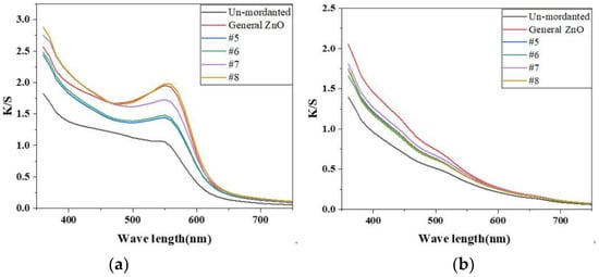 The K/S of the silk fabric dyed with hematoxylin (a) and tea polyphenols (b) under the action of different morphology nano-zinc oxide mordants at wavelengths of 350–750 nm.